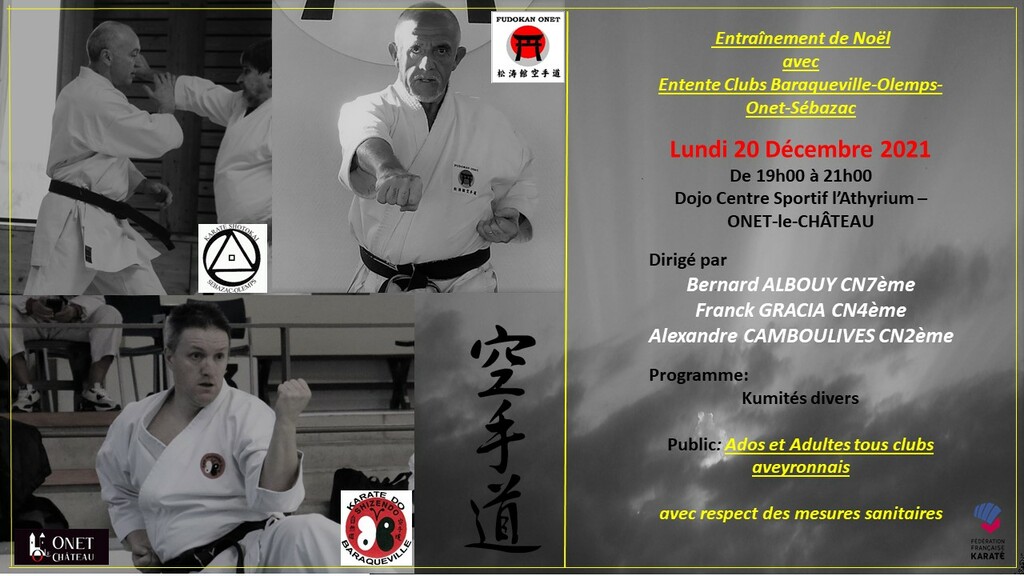 Pour clôturer cette année 2021, l'entente des clubs Baraqueville/Olemps/Onet/Sébazac propose de partager un entraînement ouvert à tous les licenciés (ados et adultes) de l'entente et des karatékas aveyronnais des différents clubs.