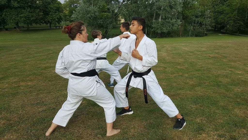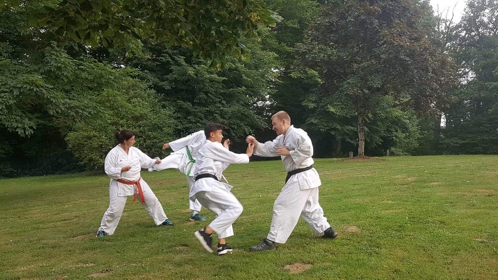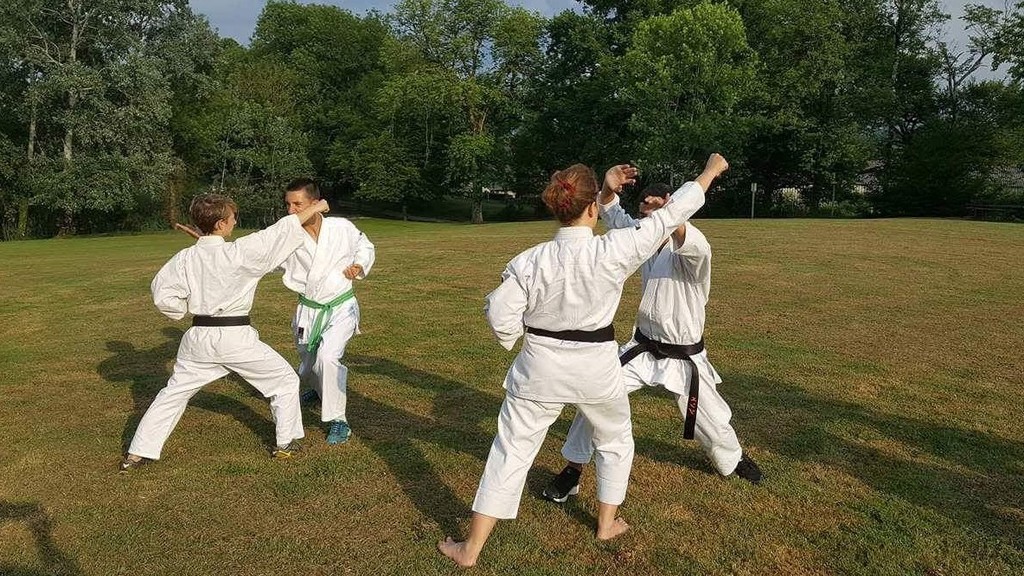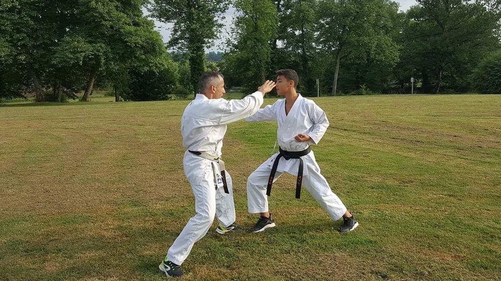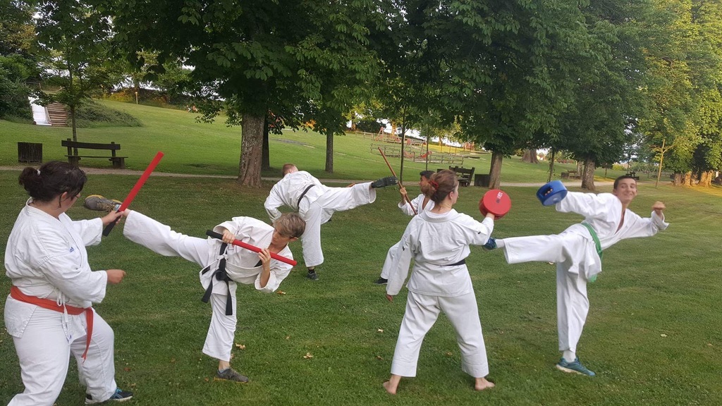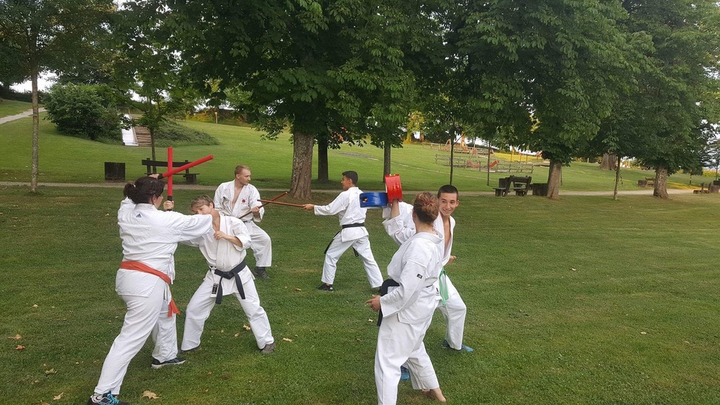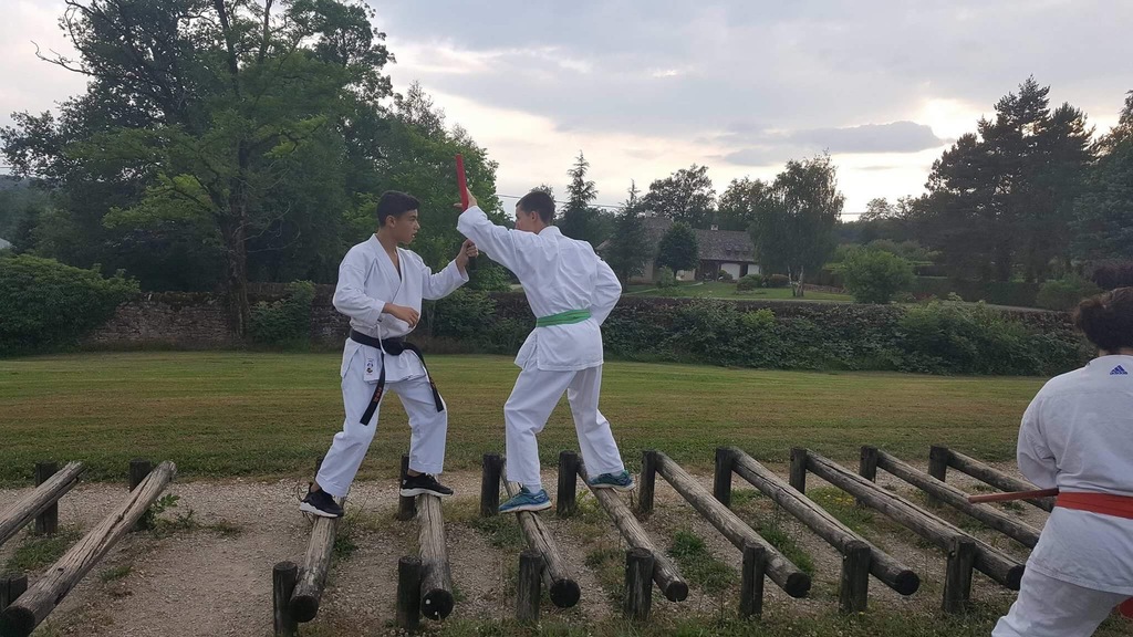 Un cours de karaté à l'extérieur dans le cadre verdoyant du Parc de Vabre et de son parcours de santé....