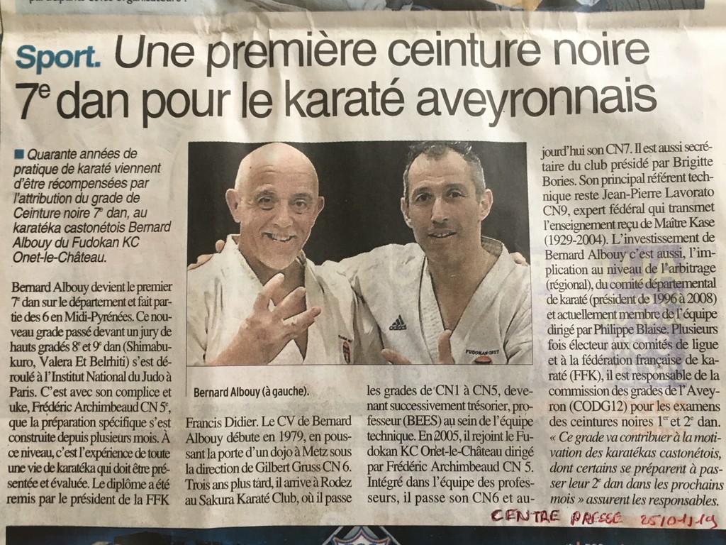 Article Centre Presse Aveyron : Première ceinture noire 7ème dan pour le karaté aveyronnais